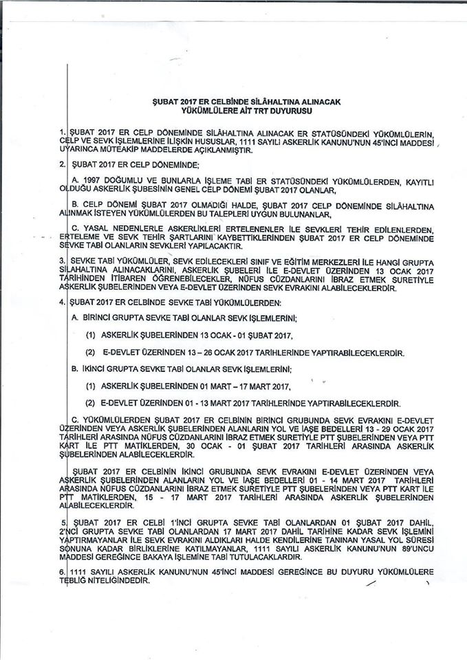 Şubat 2017 Er Celbinde Silahaltına Alınacak Yükümlülere Ait TRT Duyurusu