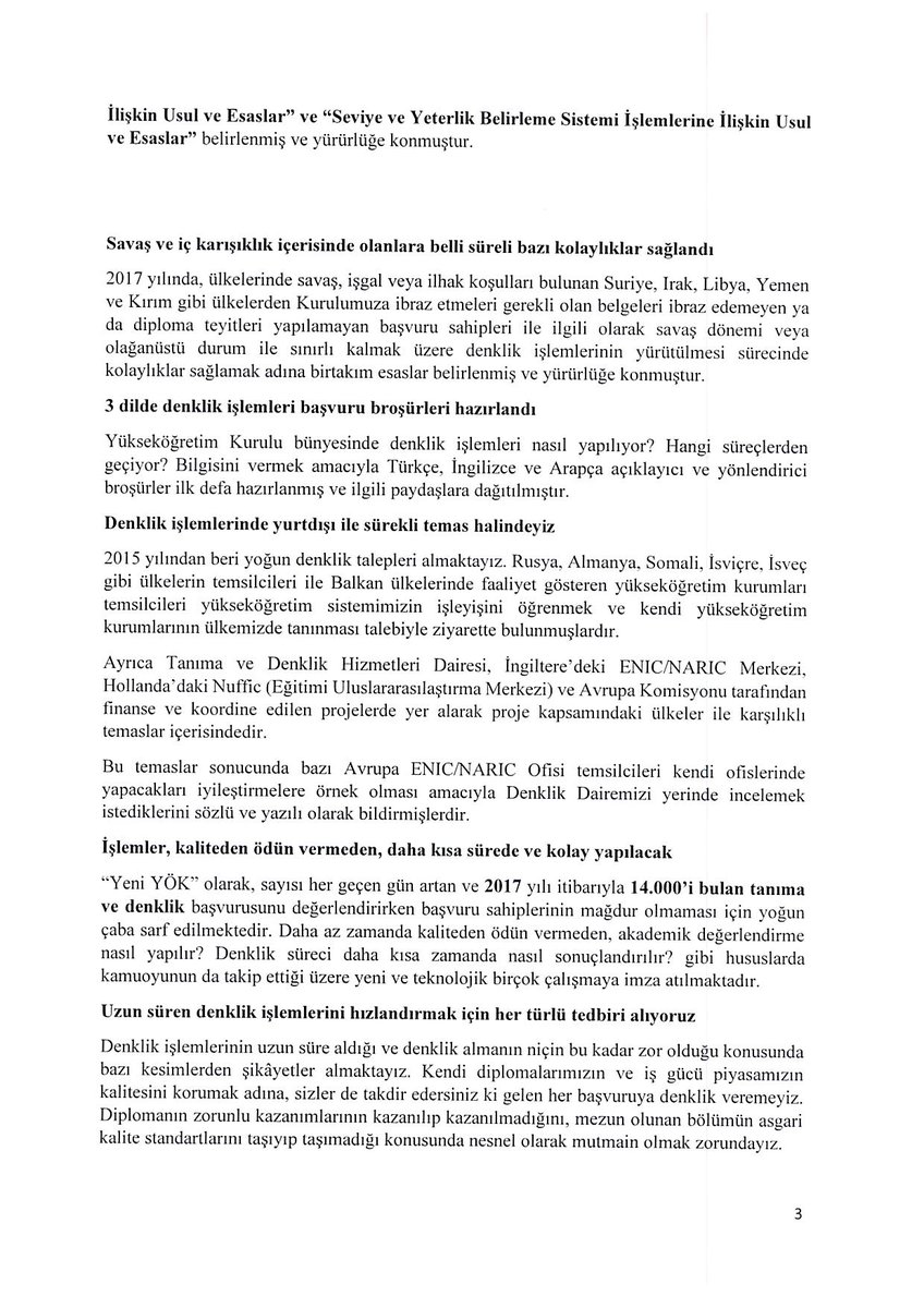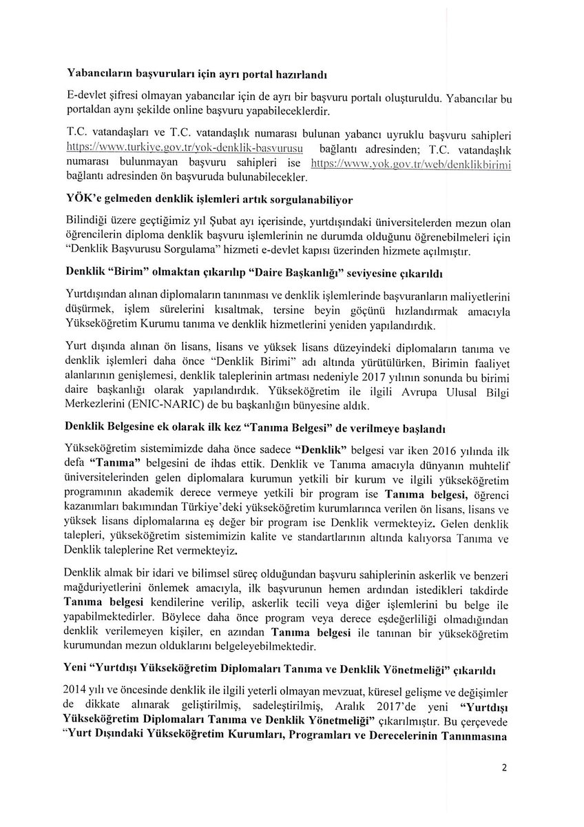 Yurtdışından alınan diplomaların denklik ve tanıma başvuruları, başvuru sahiplerince e-Devlet veya YÖK'ün web sitesindeki "Denklik Sekmesi" üzerinden online olarak yapılabilmektedir. Sözkonusu hizmete ilişkin olarak, YÖK tarafından hazırlanan Basın Bilgi Notu ekte sunulmaktadır.